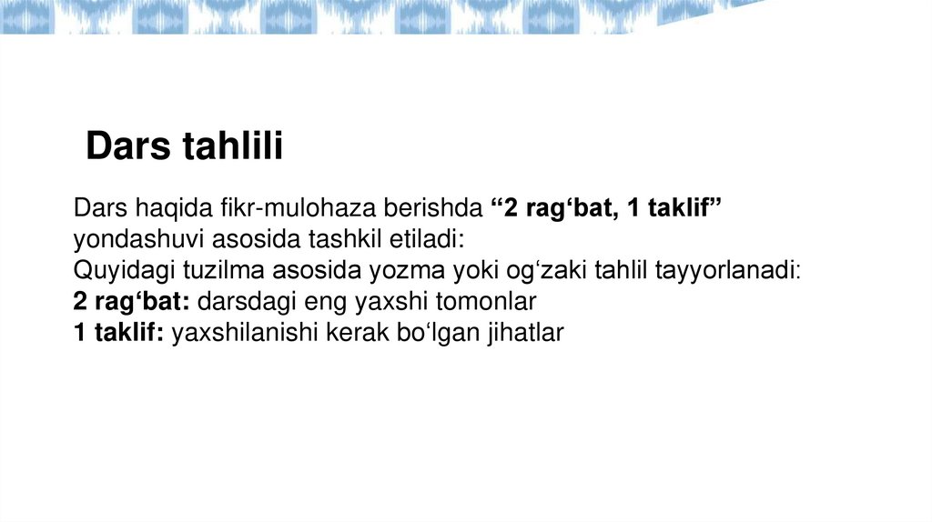 Dars tahliliDars haqida fikr-mulohaza berishda “2 rag‘bat, 1 taklif”