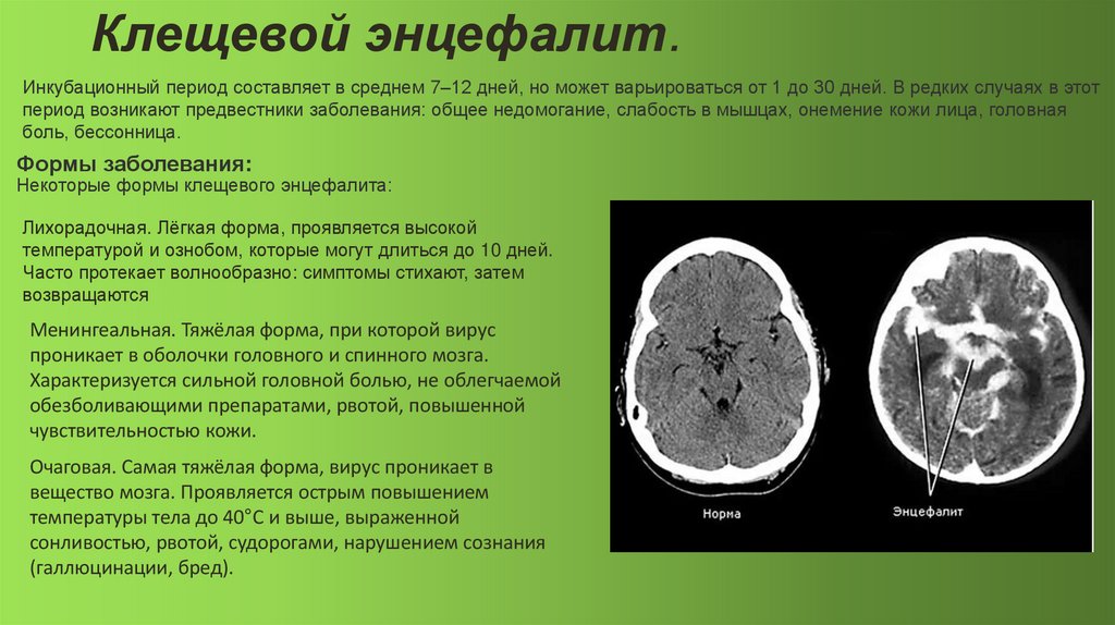 Клещевой энцефалит.Инкубационный период составляет в среднем 7–12 дней, но может варьироваться от 1 до 30 дней. В редких случаях в этот