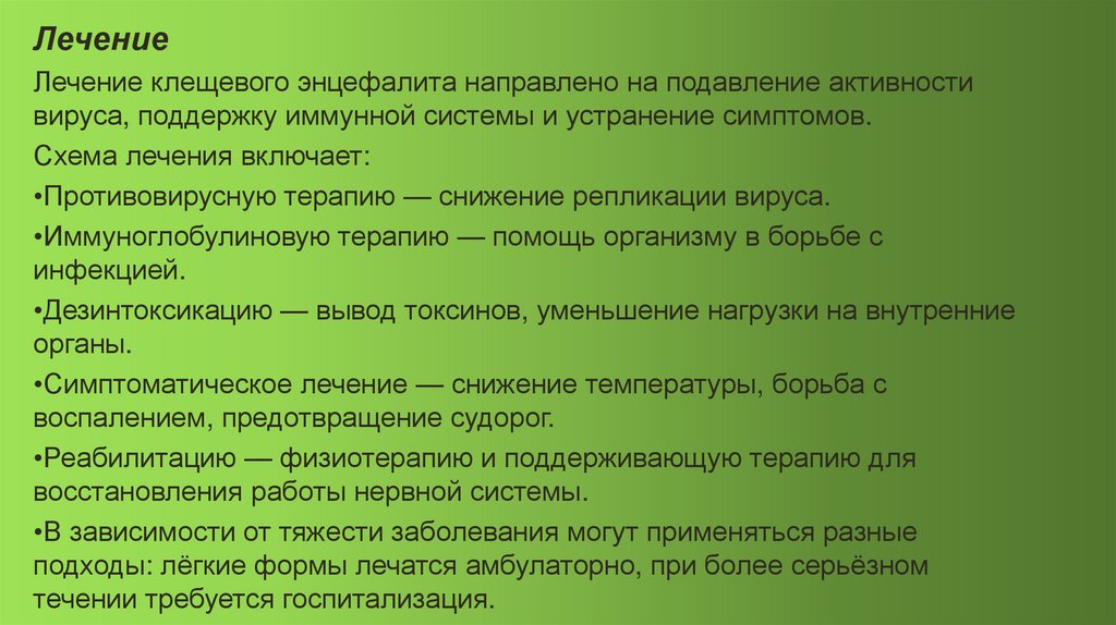 ЛечениеЛечение клещевого энцефалита направлено на подавление активности