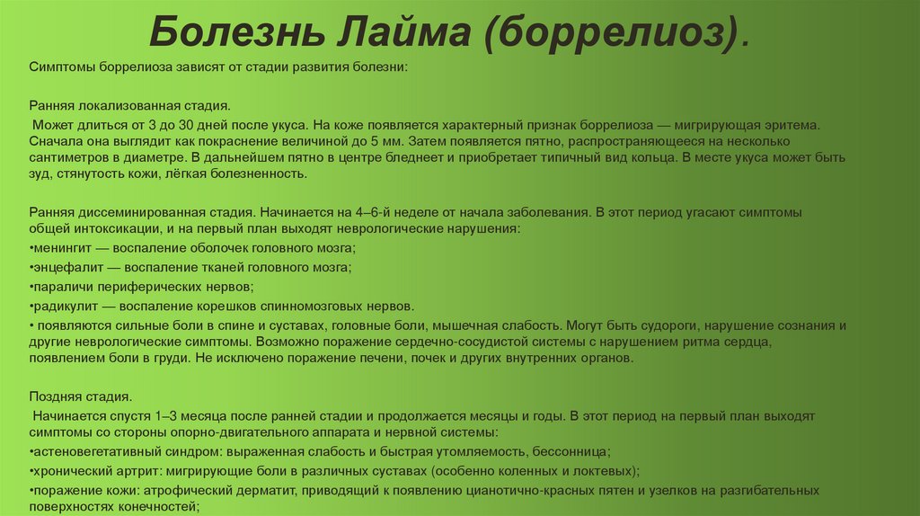 Болезнь Лайма (боррелиоз).Симптомы боррелиоза зависят от стадии развития болезни: