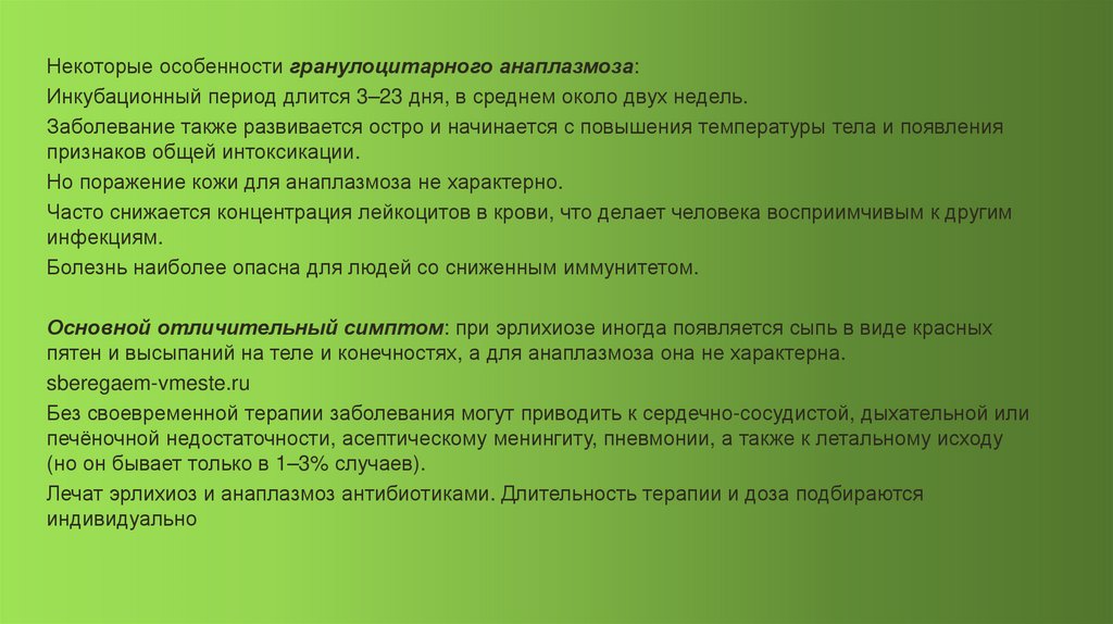 Некоторые особенности гранулоцитарного анаплазмоза:Инкубационный период длится 3–23 дня, в среднем около двух недель.