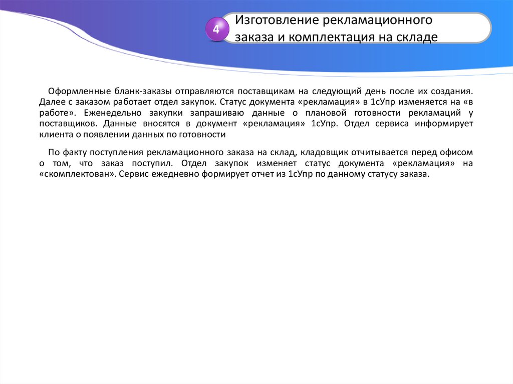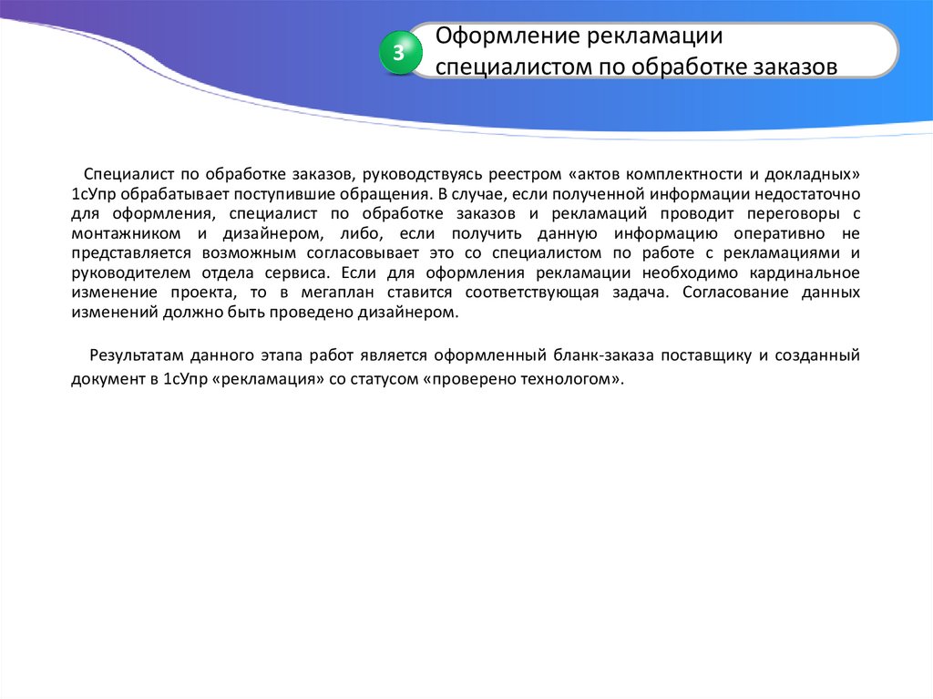 о том, что заказ поступил. Отдел закупок изменяет статус документа «рекламация» на