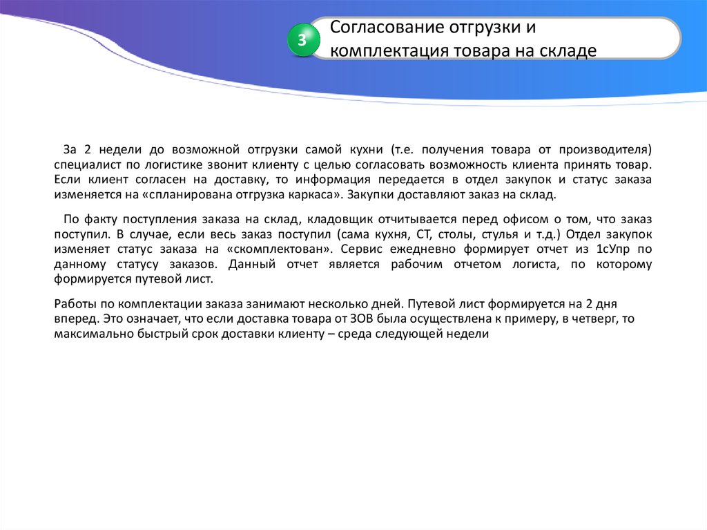 поступил. В случае, если весь заказ поступил (сама кухня, СТ, столы, стулья и т.д.) Отдел закупок