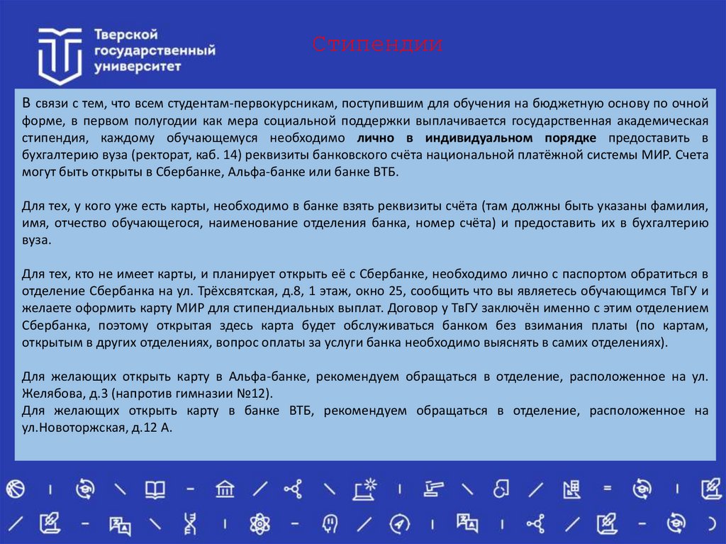 желаете оформить карту МИР для стипендиальных выплат. Договор у ТвГУ заключён именно с этим отделением