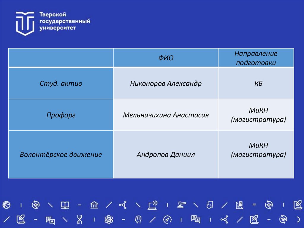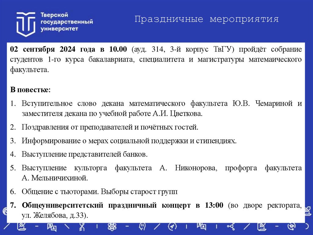 Праздничные мероприятия02 сентября 2024 года в 10.00 (ауд. 314, 3-й корпус ТвГУ) пройдёт собрание