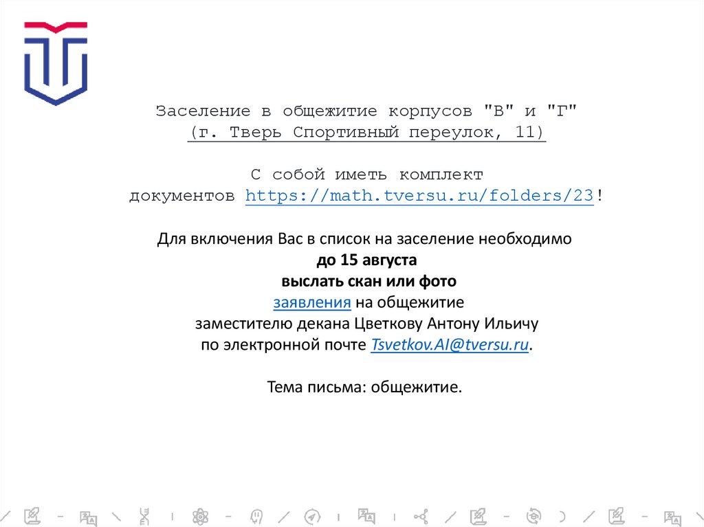 Заселение в общежитие корпусов "В" и "Г"(г. Тверь Спортивный переулок, 11)