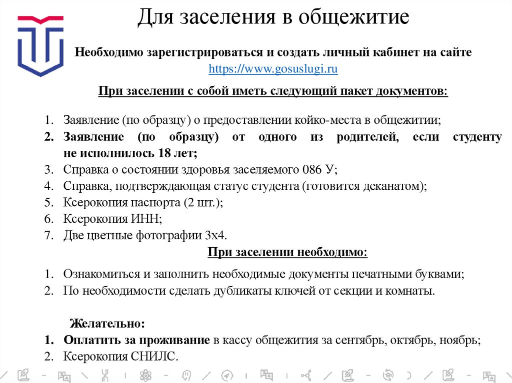 Для заселения в общежитиеНеобходимо зарегистрироваться и создать личный кабинет на сайте