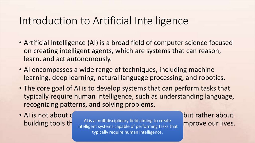 Introduction to Artificial Intelligence• Artificial Intelligence (AI) is a broad field of computer science focused