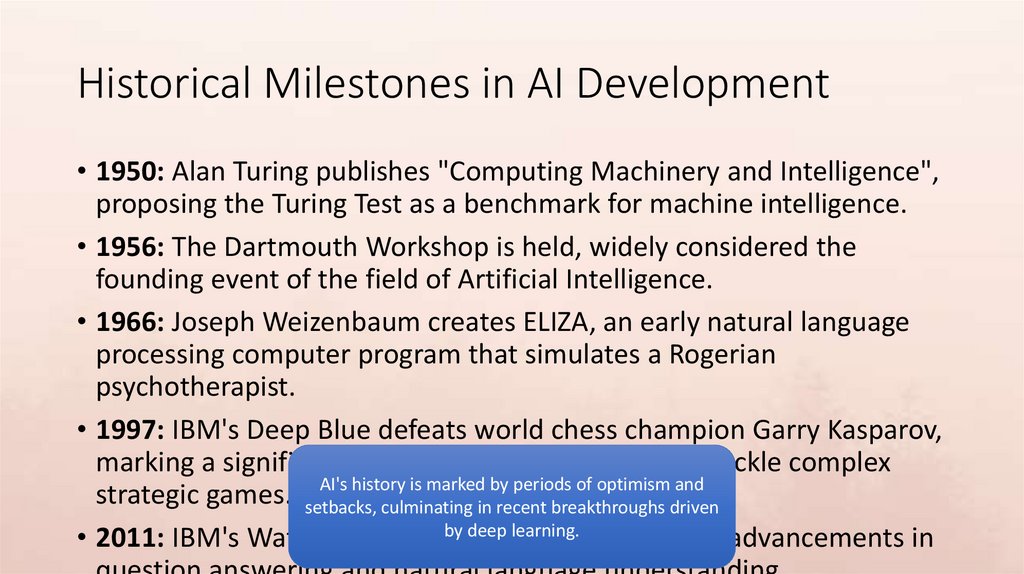 Historical Milestones in AI Development• 1950: Alan Turing publishes "Computing Machinery and Intelligence",