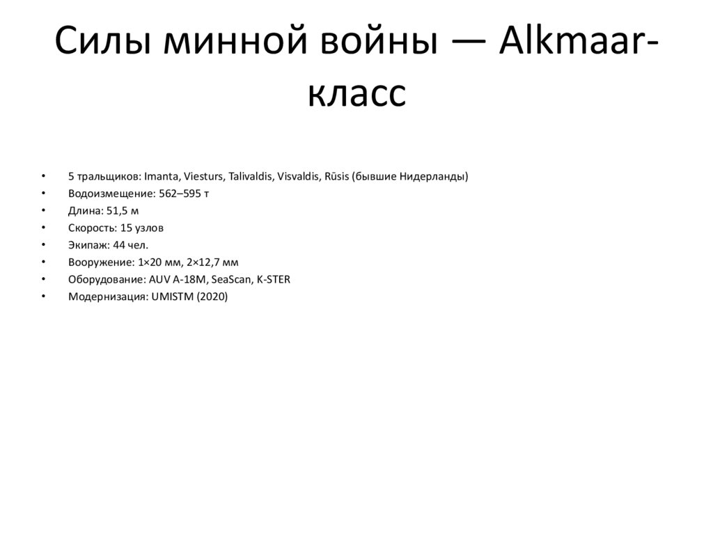 Силы минной войны — Alkmaarкласс5 тральщиков: Imanta, Viesturs, Talivaldis, Visvaldis, Rūsis (бывшие Нидерланды)