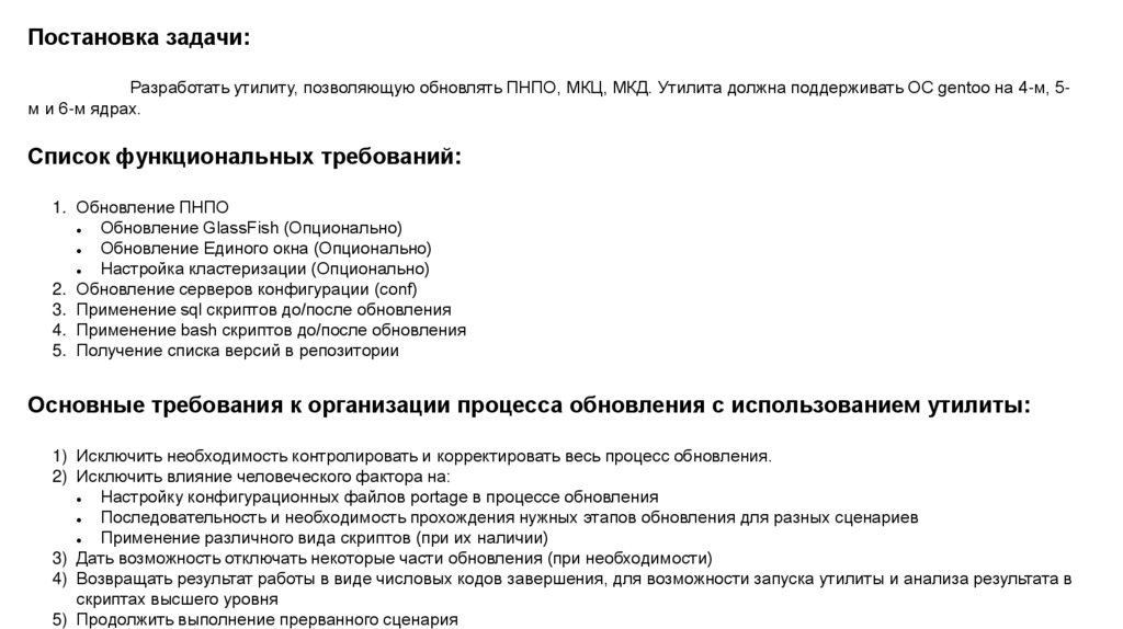 Постановка задачи:Разработать утилиту, позволяющую обновлять ПНПО, МКЦ, МКД. Утилита должна поддерживать ОС gentoo на 4-м, 5м и 6-м ядрах.