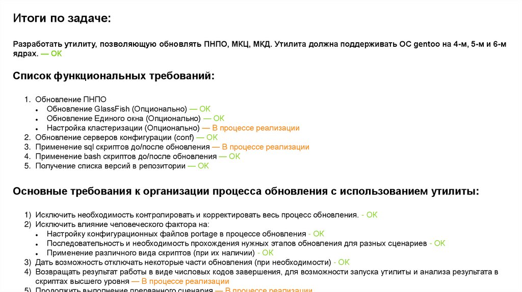Итоги по задаче:Разработать утилиту, позволяющую обновлять ПНПО, МКЦ, МКД. Утилита должна поддерживать ОС gentoo на 4-м, 5-м и 6-м
