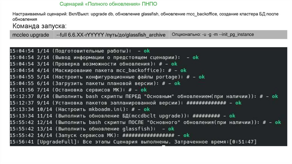 Сценарий «Полного обновления» ПНПОНастраиваемый сценарий: Вкл/Выкл: upgrade db, обновление glassfish, обновление mcc_backoffice, создание кластера БД после