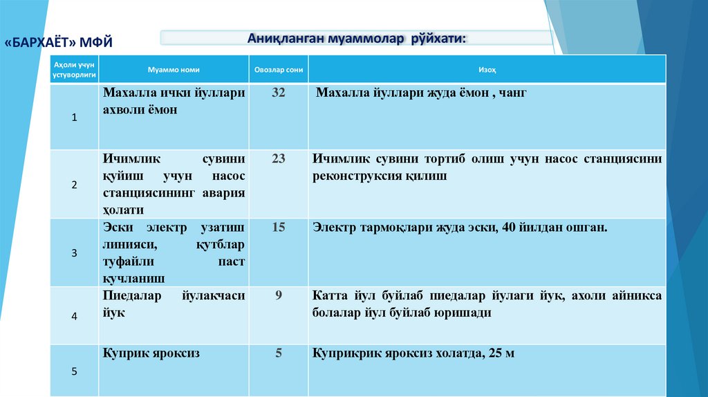 Аниқланган муаммолар рўйхати:«БАРХАЁТ» МФЙ