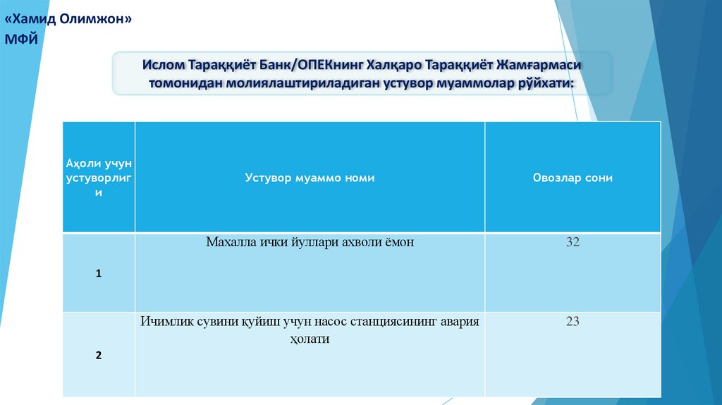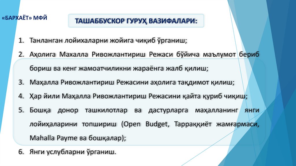 3. Маҳалла Ривожлантириш Режасини аҳолига тақдимот қилиш;