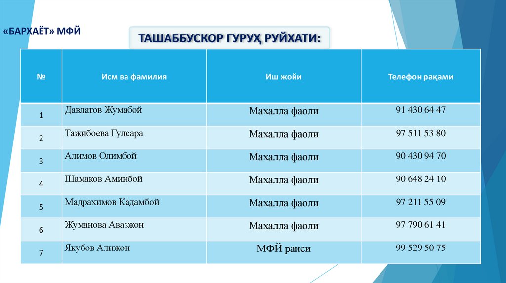 «БАРХАЁТ» МФЙТАШАББУСКОР ГУРУҲ ВАЗИФАЛАРИ: