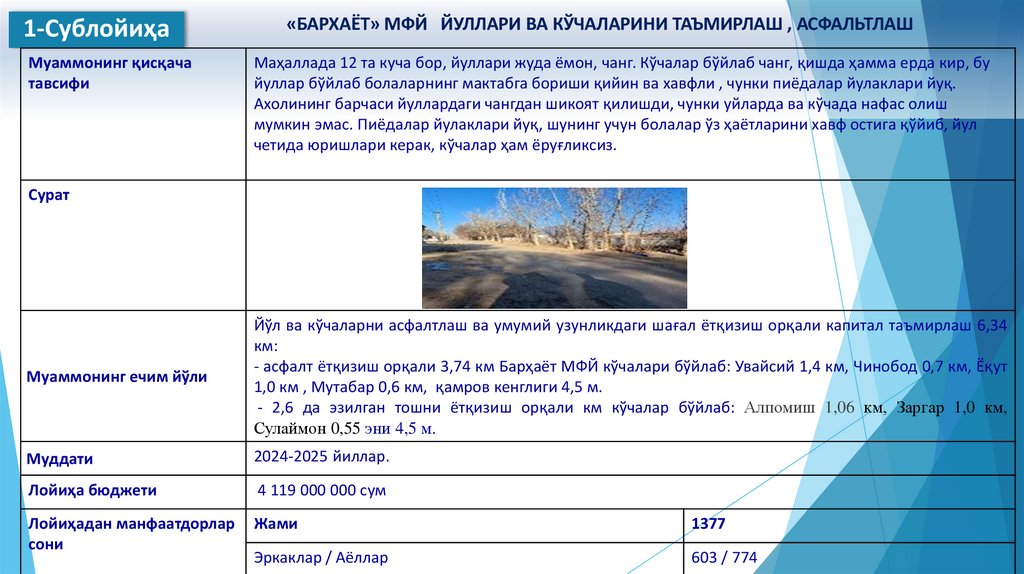 «БАРХАЁТ» МФЙ ЙУЛЛАРИ ВА КЎЧАЛАРИНИ ТАЪМИРЛАШ , АСФАЛЬТЛАШ