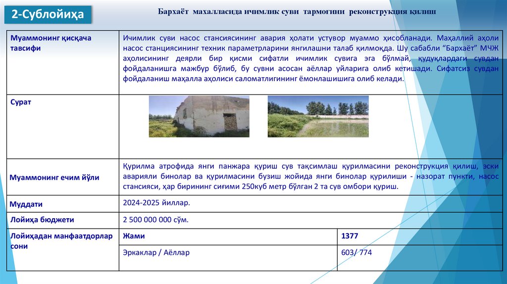 Бархаёт махалласида ичимлик суви тармоғини реконструкция қилиш2-Сублойиҳа