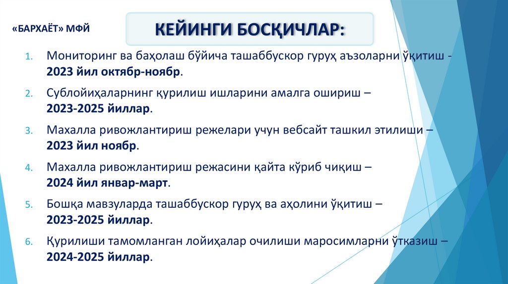 «БАРХАЁТ» МФЙКЕЙИНГИ БОСҚИЧЛАР: