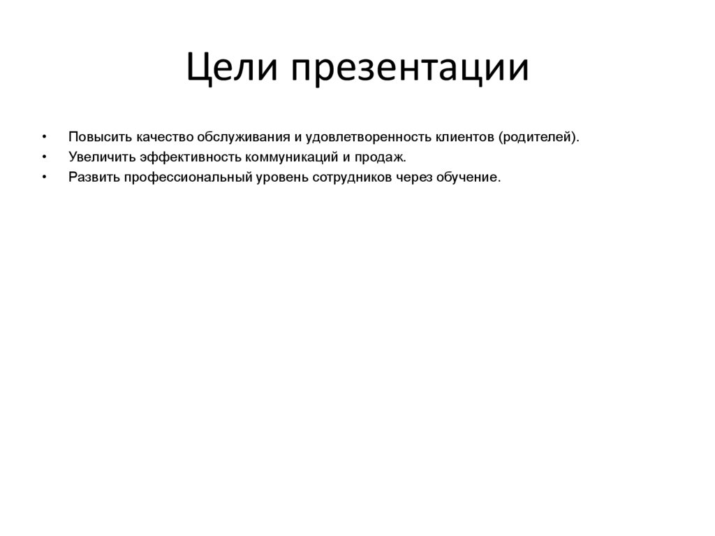 Цели презентацииПовысить качество обслуживания и удовлетворенность клиентов (родителей).