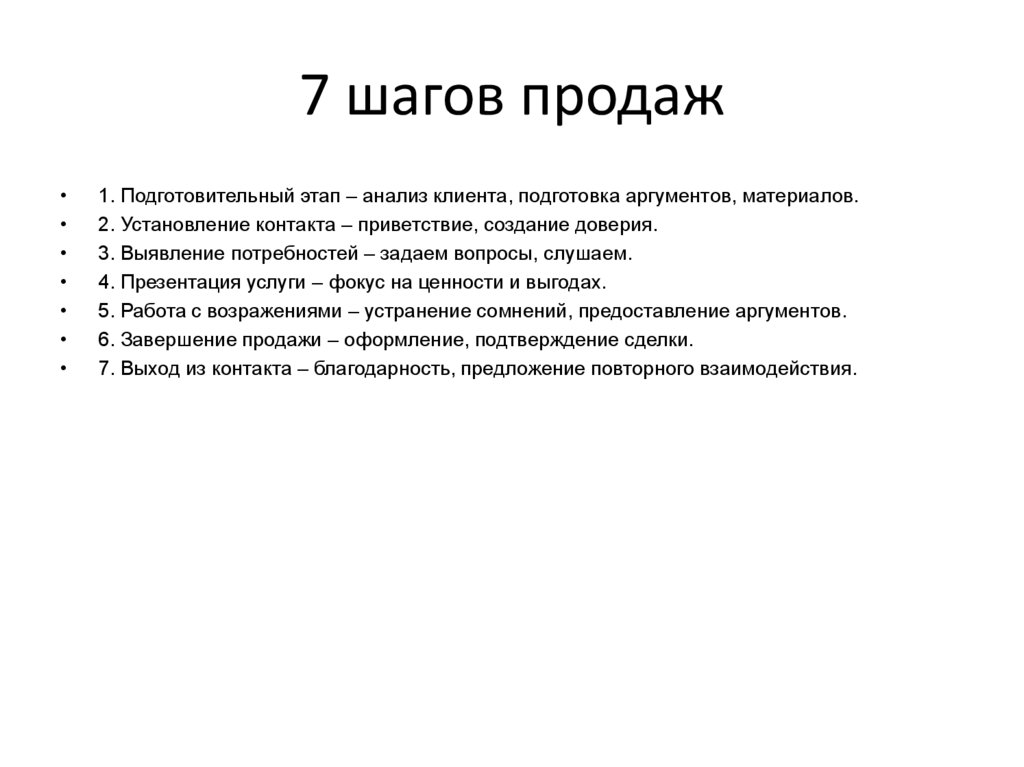 7 шагов продаж1. Подготовительный этап – анализ клиента, подготовка аргументов, материалов.