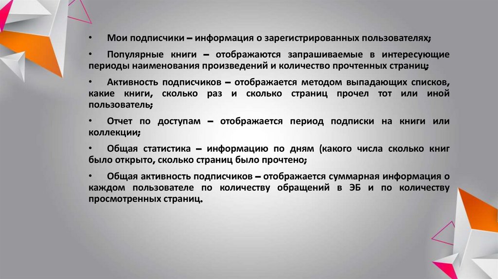 • Отчет по доступам – отображается период подписки на книги или