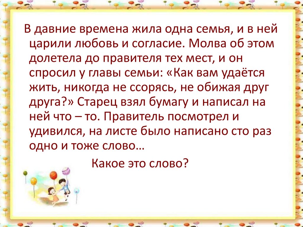В давние времена жила одна семья, и в нейцарили любовь и согласие. Молва об этом