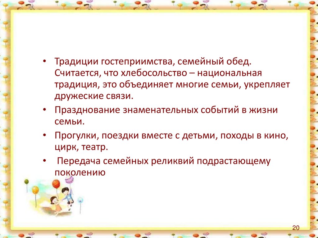 • Традиции гостеприимства, семейный обед.Считается, что хлебосольство – национальная