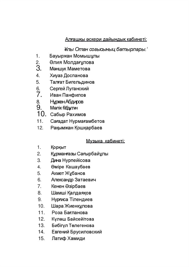 Алғашқы әскери дайындық кабинеті:¥лы Отан согысыныц батырлары.‘