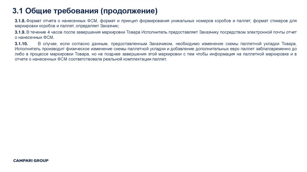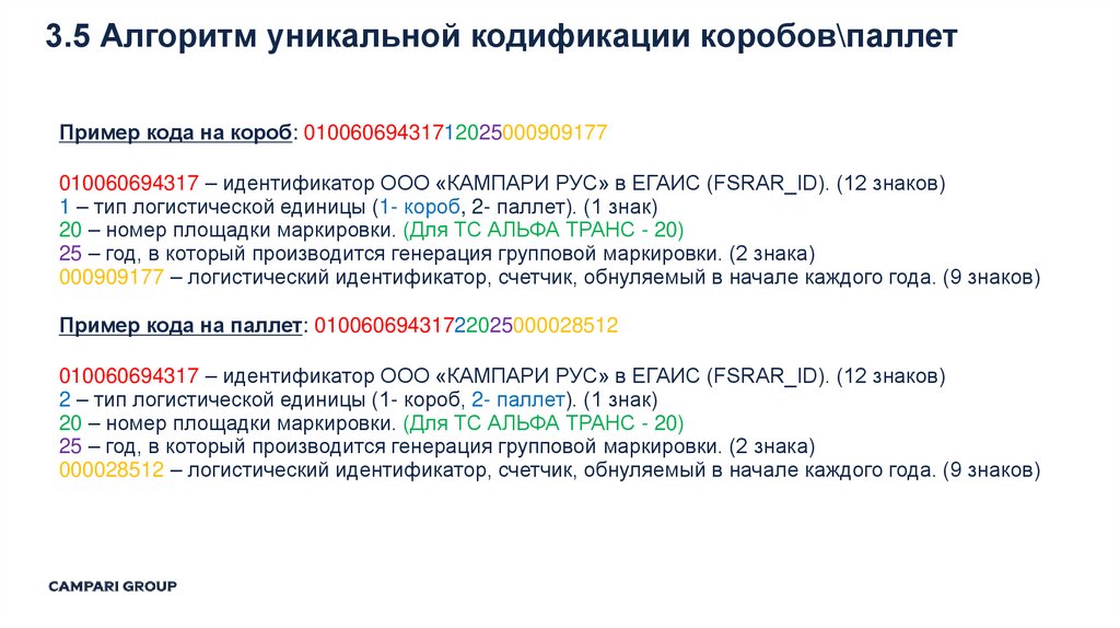 3.1.1.Исполнитель формирует уникальные цифровые идентификаторы коробов и паллет согласно требованиям Заказчика (п. 3.5);