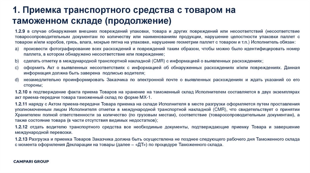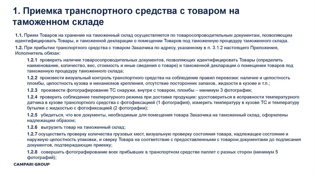 1.1. Прием Товаров на хранение на таможенный склад осуществляется по товаросопроводительным документам, позволяющим