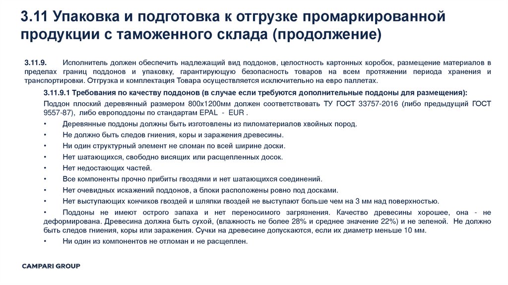 3.11.9.1 Требования по качеству поддонов (в случае если требуются дополнительные поддоны для размещения):