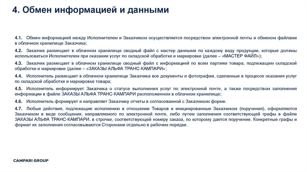 4. Обмен информацией и данными4.1. Обмен информацией между Исполнителем и Заказчиком осуществляется посредством электронной почты и обменом файлами