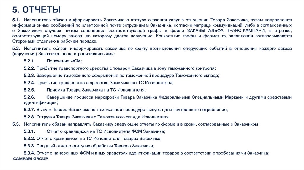 5. ОТЧЕТЫ5.1. Исполнитель обязан информировать Заказчика о статусе оказания услуг в отношении Товара Заказчика, путем направления