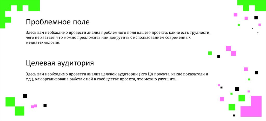 Проблемное полеЗдесь вам необходимо провести анализ проблемного поля вашего проекта: какие есть трудности,
