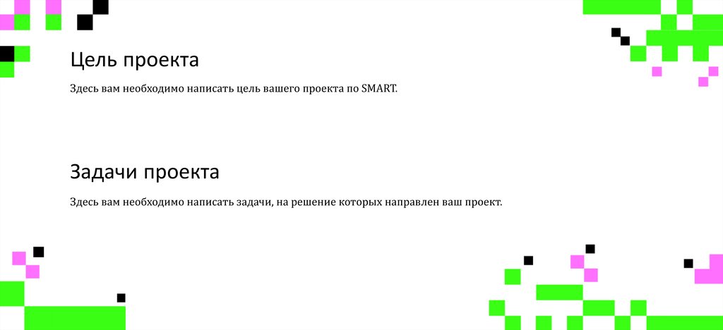 Цель проектаЗдесь вам необходимо написать цель вашего проекта по SMART.
