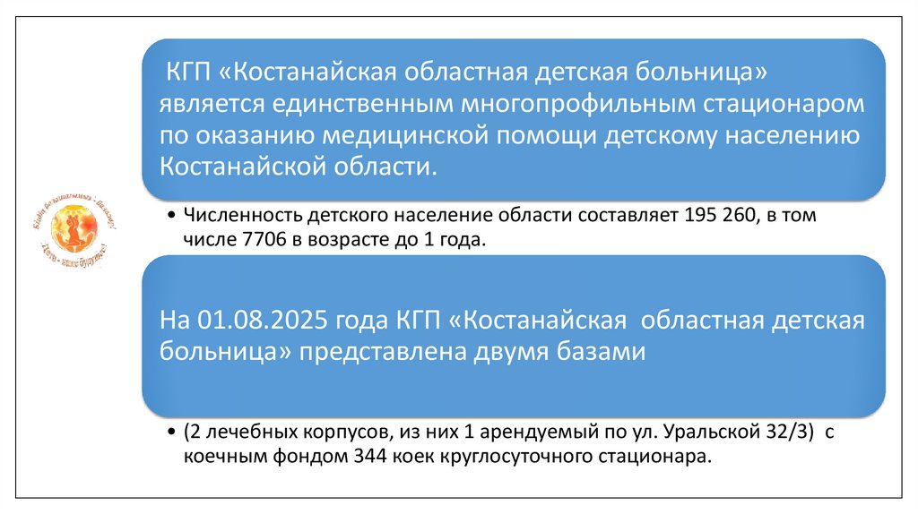 КГП «Костанайская областная детская больница»является единственным многопрофильным стационаром