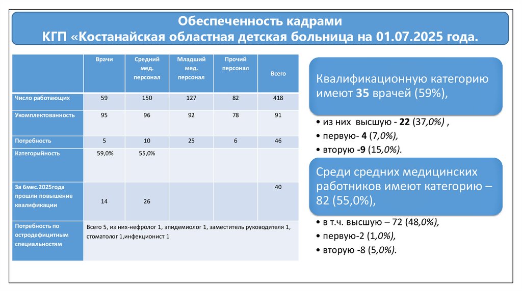 Обеспеченность кадрамиКГП «Костанайская областная детская больница на 01.07.2025 года.