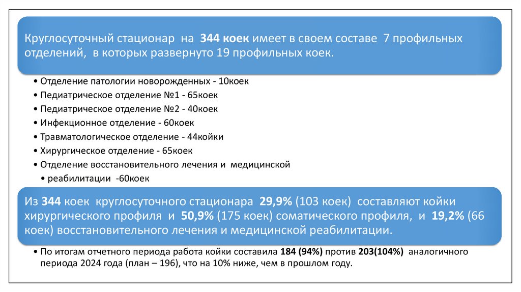 Из 344 коек круглосуточного стационара 29,9% (103 коек) составляют койки
