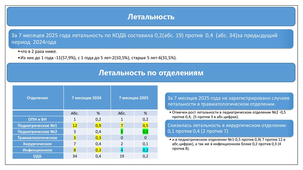 ЛетальностьЗа 7 месяцев 2025 года летальность по КОДБ составила 0,2(абс. 19) против 0,4 (абс. 34)за предыдущий