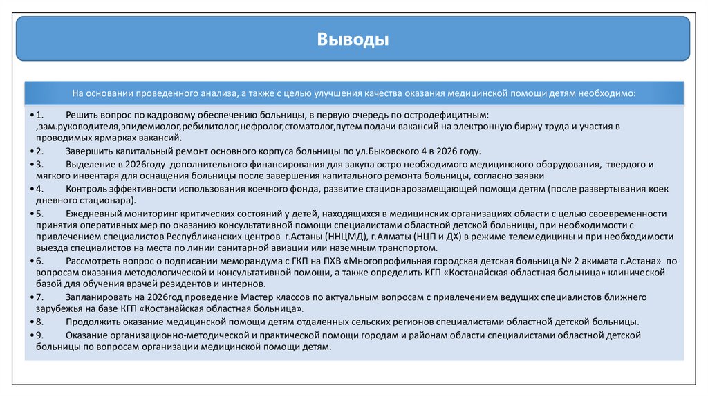 ВыводыНа основании проведенного анализа, а также с целью улучшения качества оказания медицинской помощи детям необходимо: