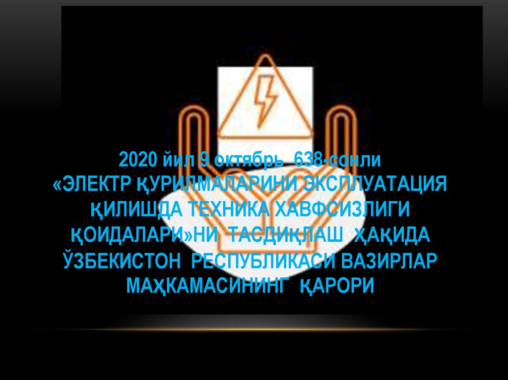 2020 йил 9 октябрь 638-сонли«ЭЛЕКТР ҚУРИЛМАЛАРИНИ ЭКСПЛУАТАЦИЯ