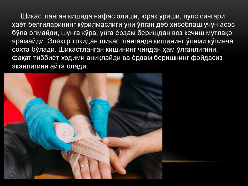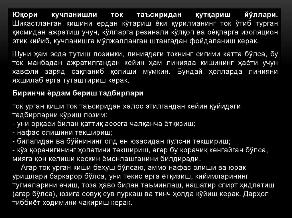 ток урган киши ток таъсиридан халос этилгандан кейин қуйидаги