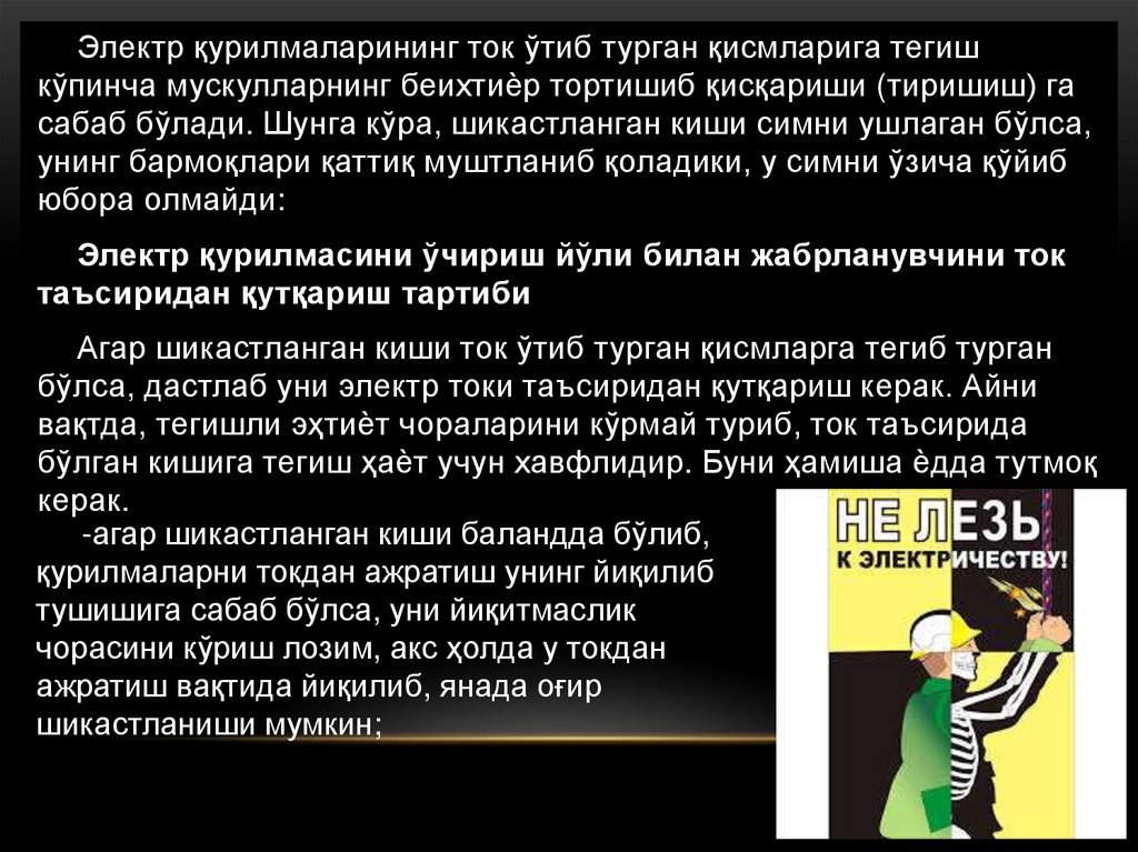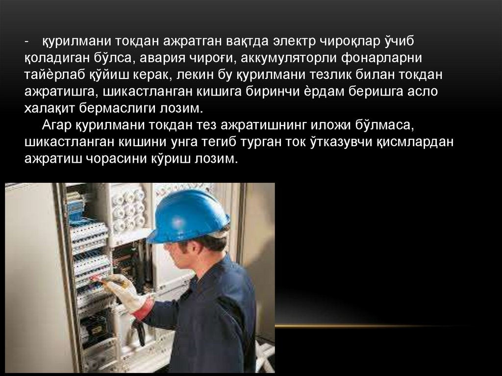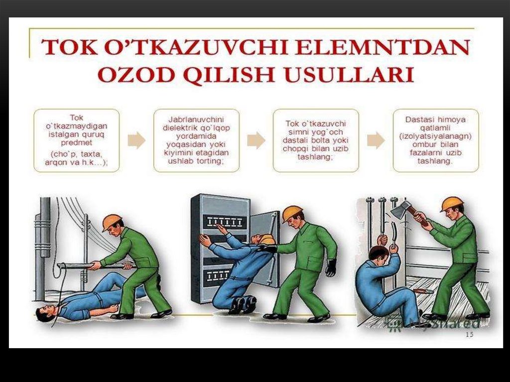 қисмидан ажратиш учун, қўлларга резинали қўлқоп ва оѐқларга изоляцион