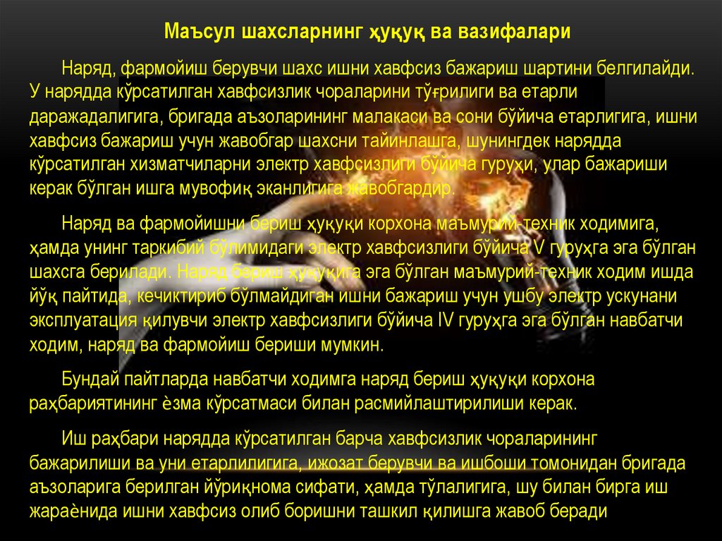 Маъсул шахсларнинг ҳуқуқ ва вазифалариНаряд, фармойиш берувчи шахс ишни хавфсиз бажариш шартини белгилайди.