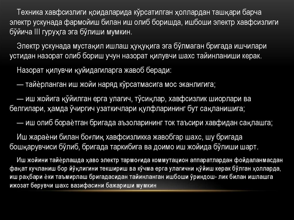 Техника хавфсизлиги қоидаларида кўрсатилган ҳоллардан ташқари барчаэлектр ускунада фармойиш билан иш олиб боришда, ишбоши электр хавфсизлиги