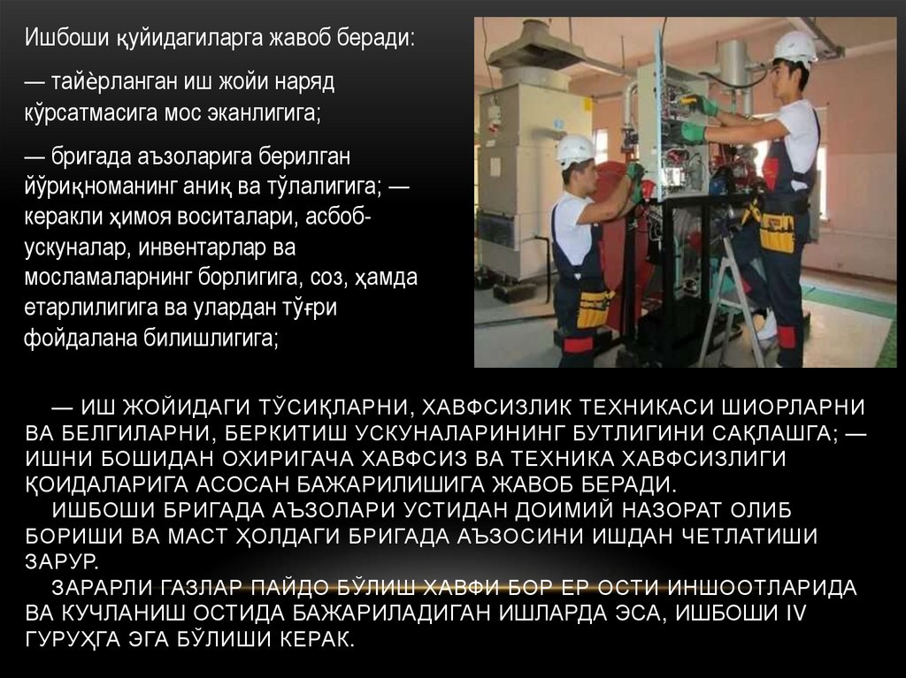 Ишбоши қуйидагиларга жавоб беради:— тайѐрланган иш жойи наряд