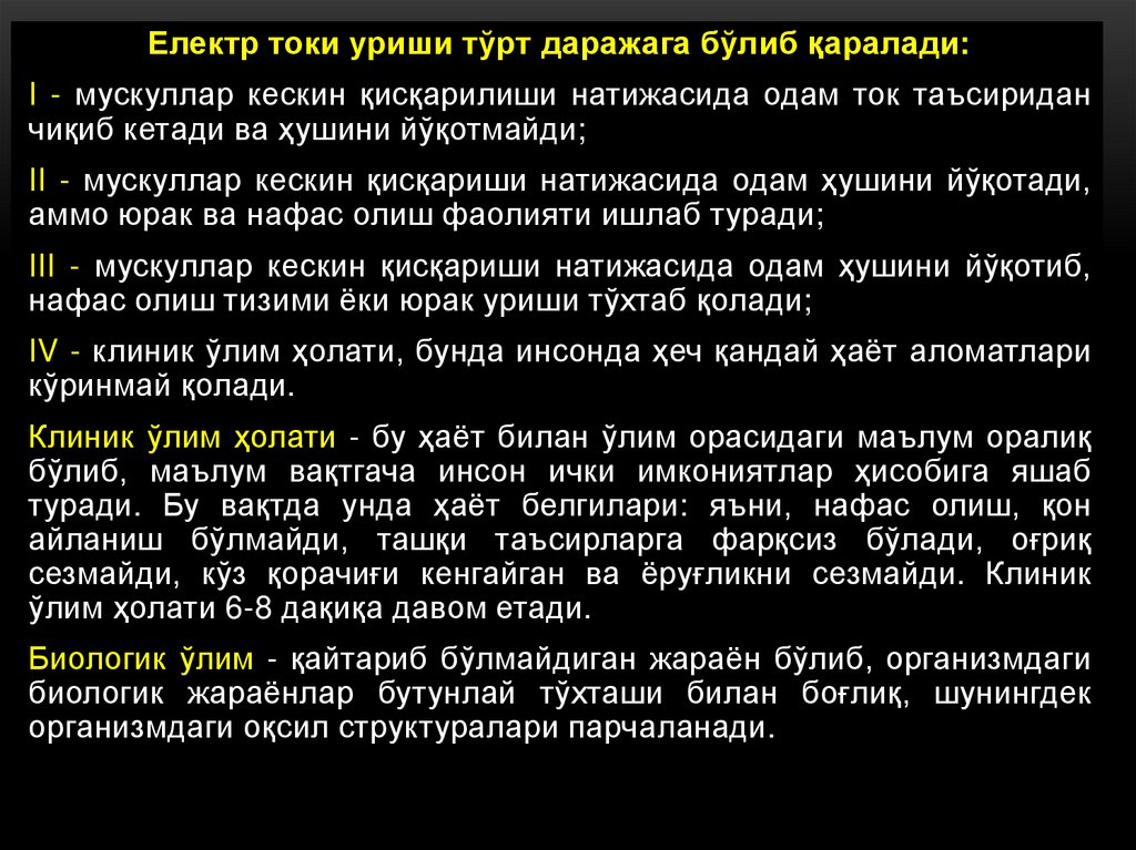 Электр токининг одамларга хавфли вазарарли таъсири даражаси қуйидагиларга