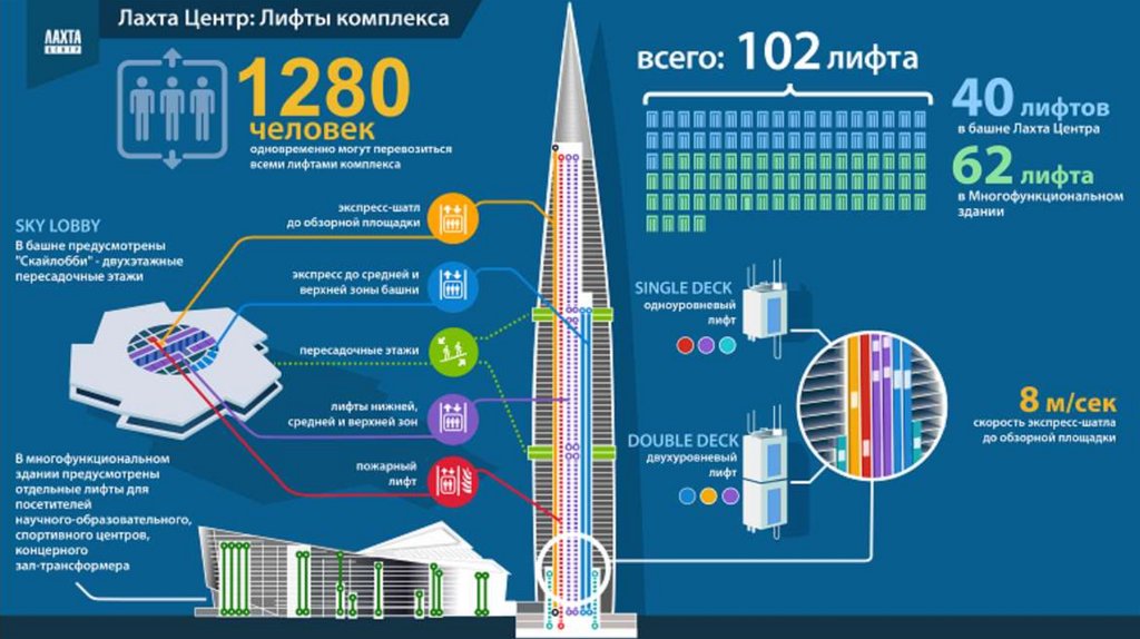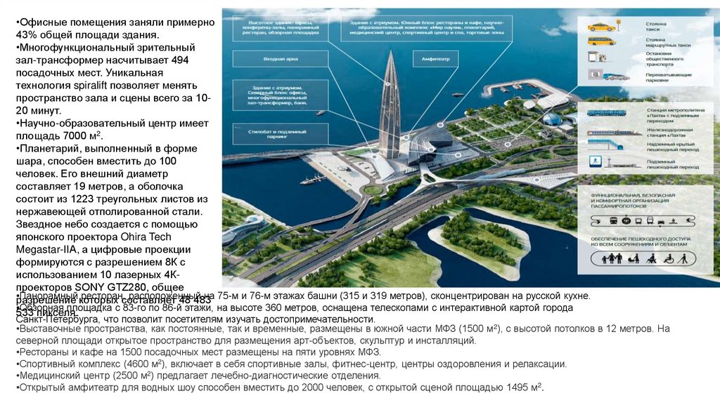 •Рестораны и кафе на 1500 посадочных мест размещены на пяти уровнях МФЗ.