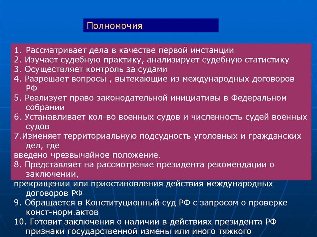 Полномочия1. Рассматривает дела в качестве первой инстанции